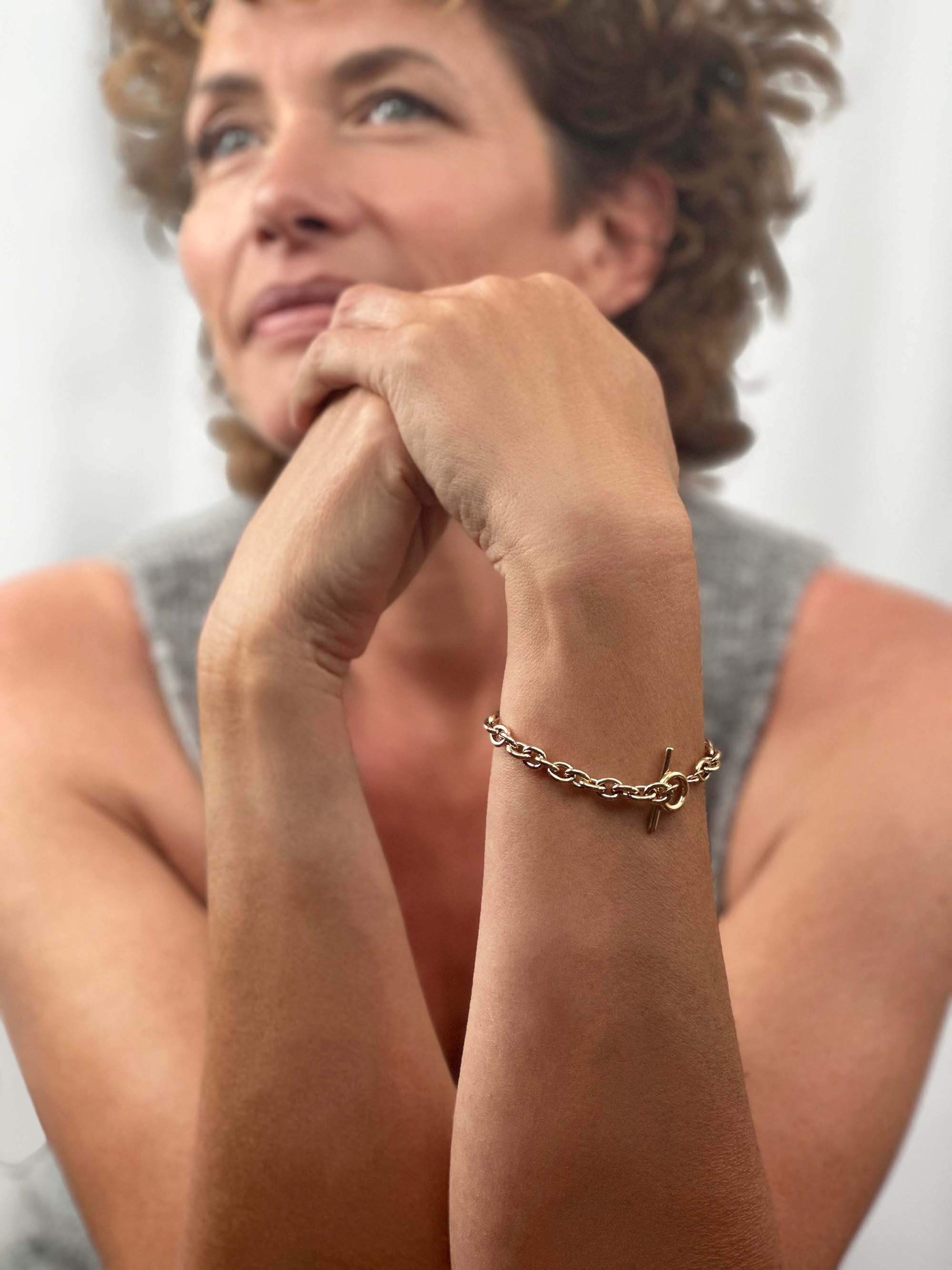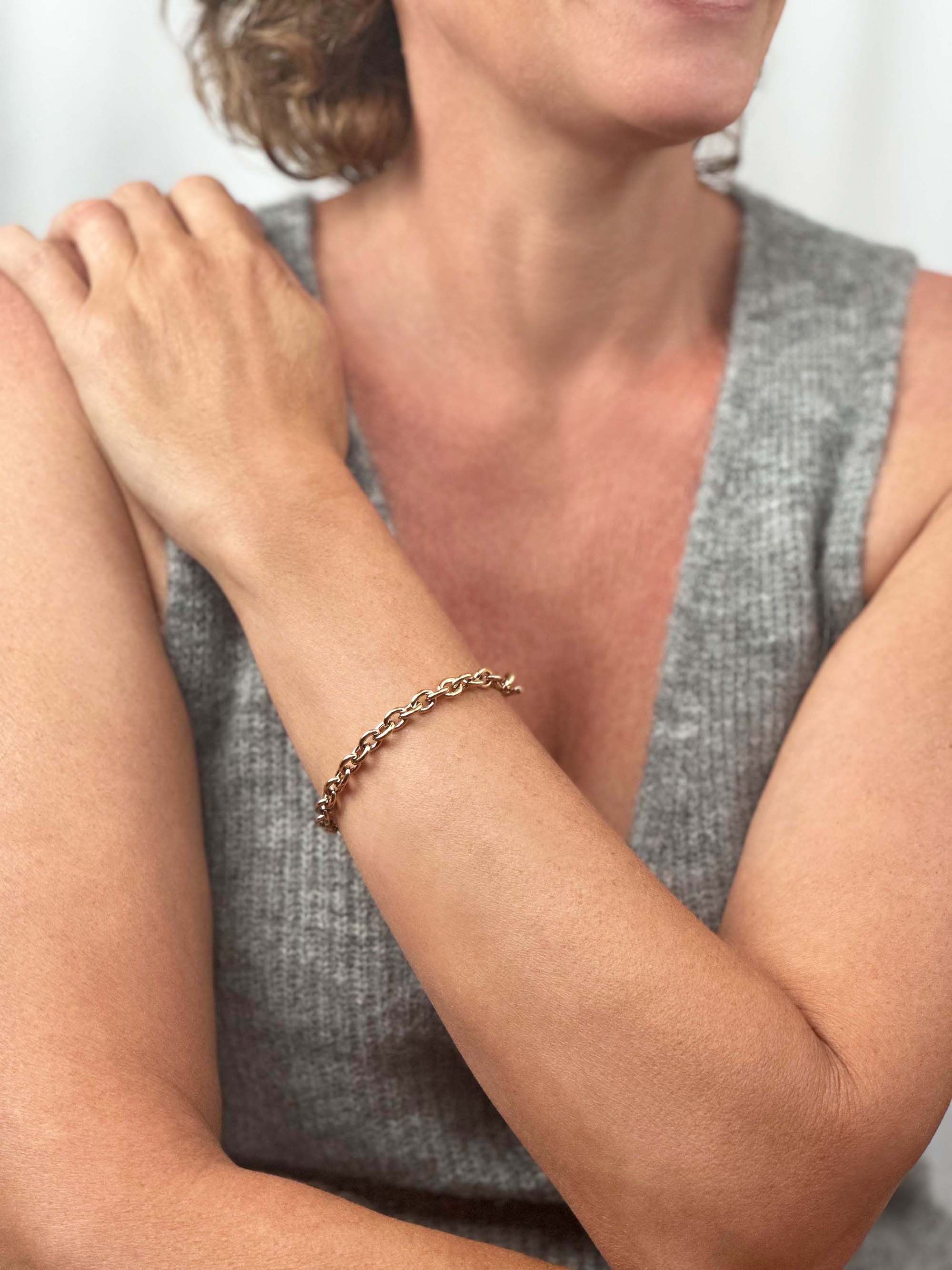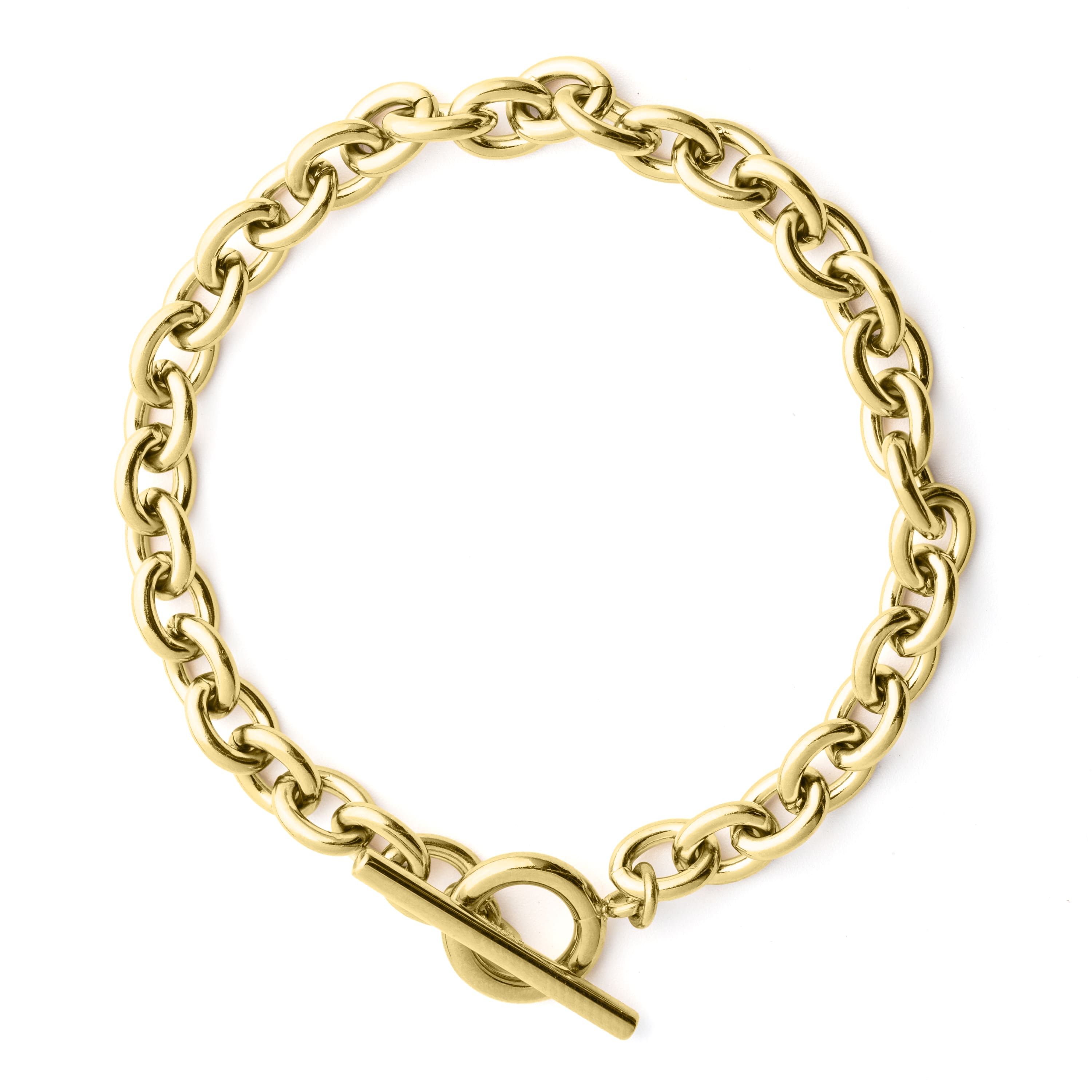 Bold yet refined, the T Clasp Bracelet features chunky rounded links finished with a sleek toggle clasp. It’s a modern take on a timeless design—easy to fasten, effortlessly stylish, and made to be noticed. The perfect piece for adding a polished statement to your everyday look.