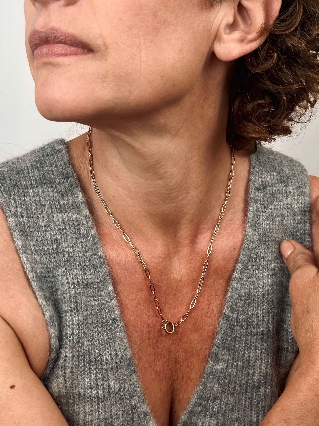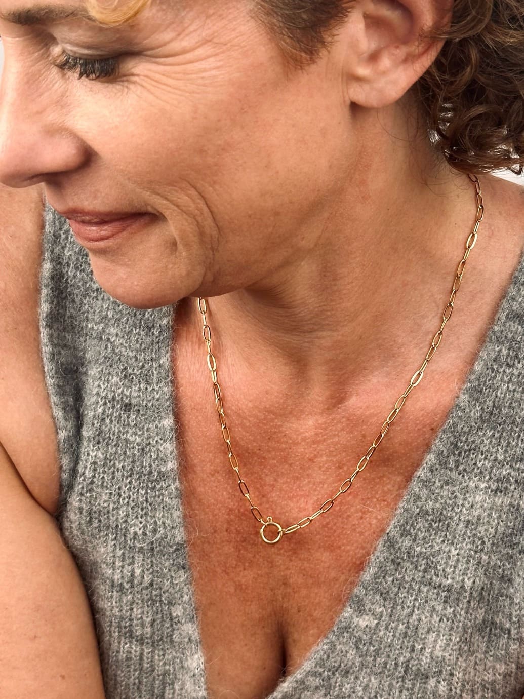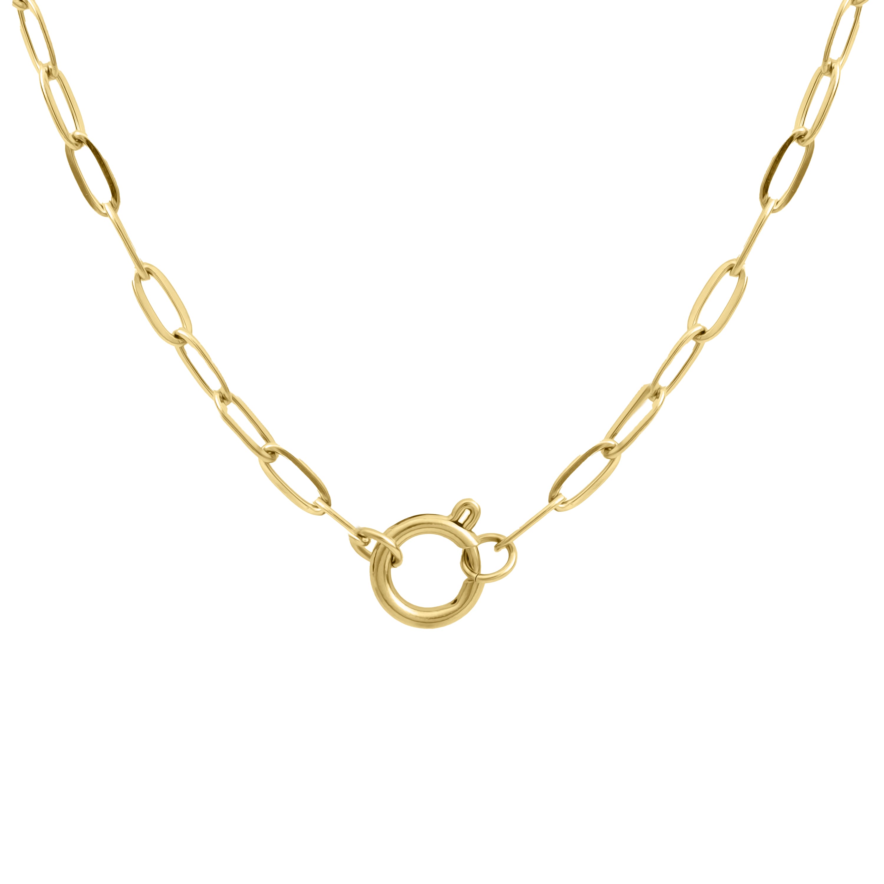Minimal with a modern edge, the Paperclip O Necklace features elongated chain links and a bold circular clasp detail at the front. Wear it as-is for sleek styling, or clip on a birthstone charm or two to make it your own. Effortless, elegant, and made for layering.