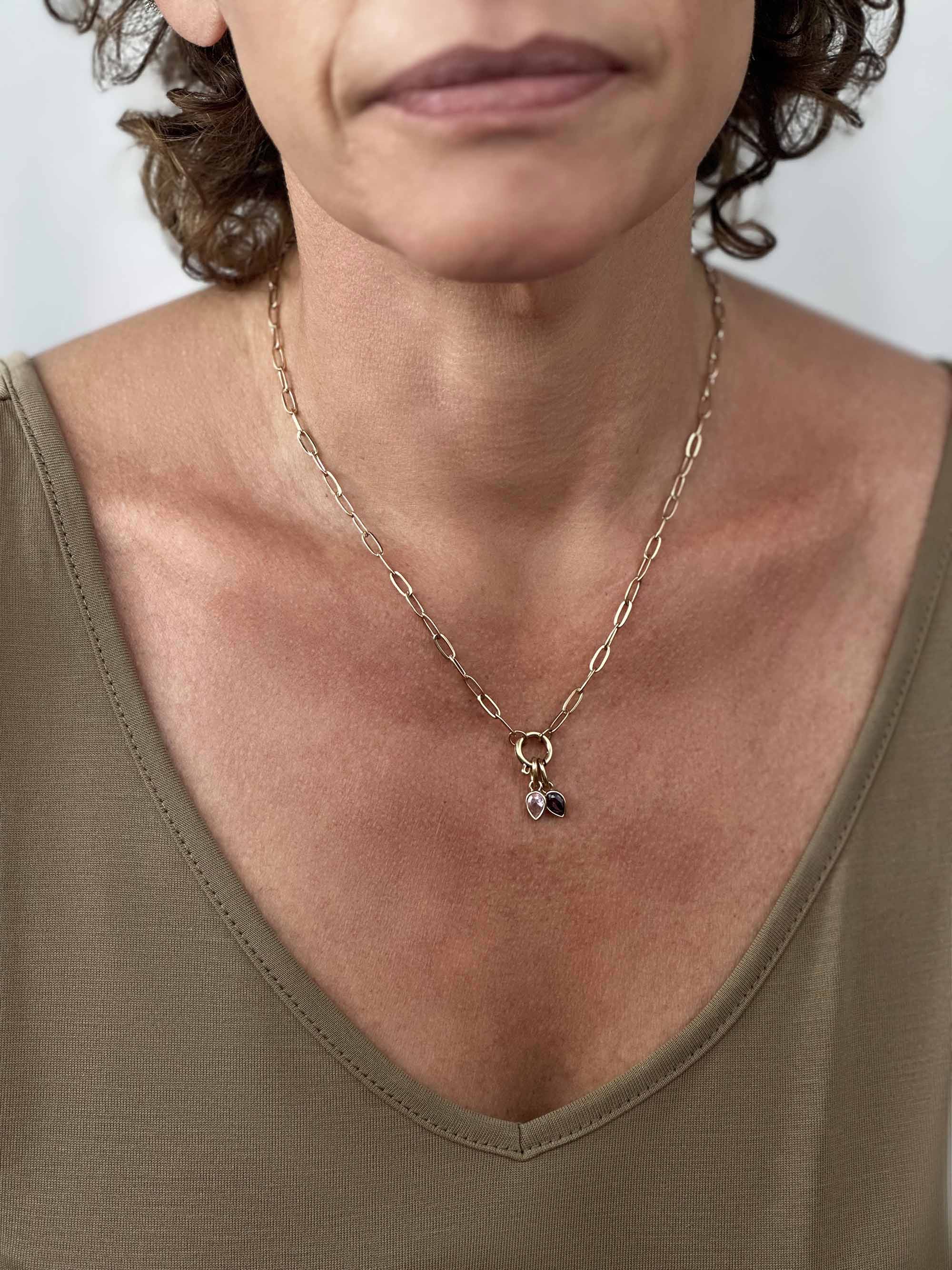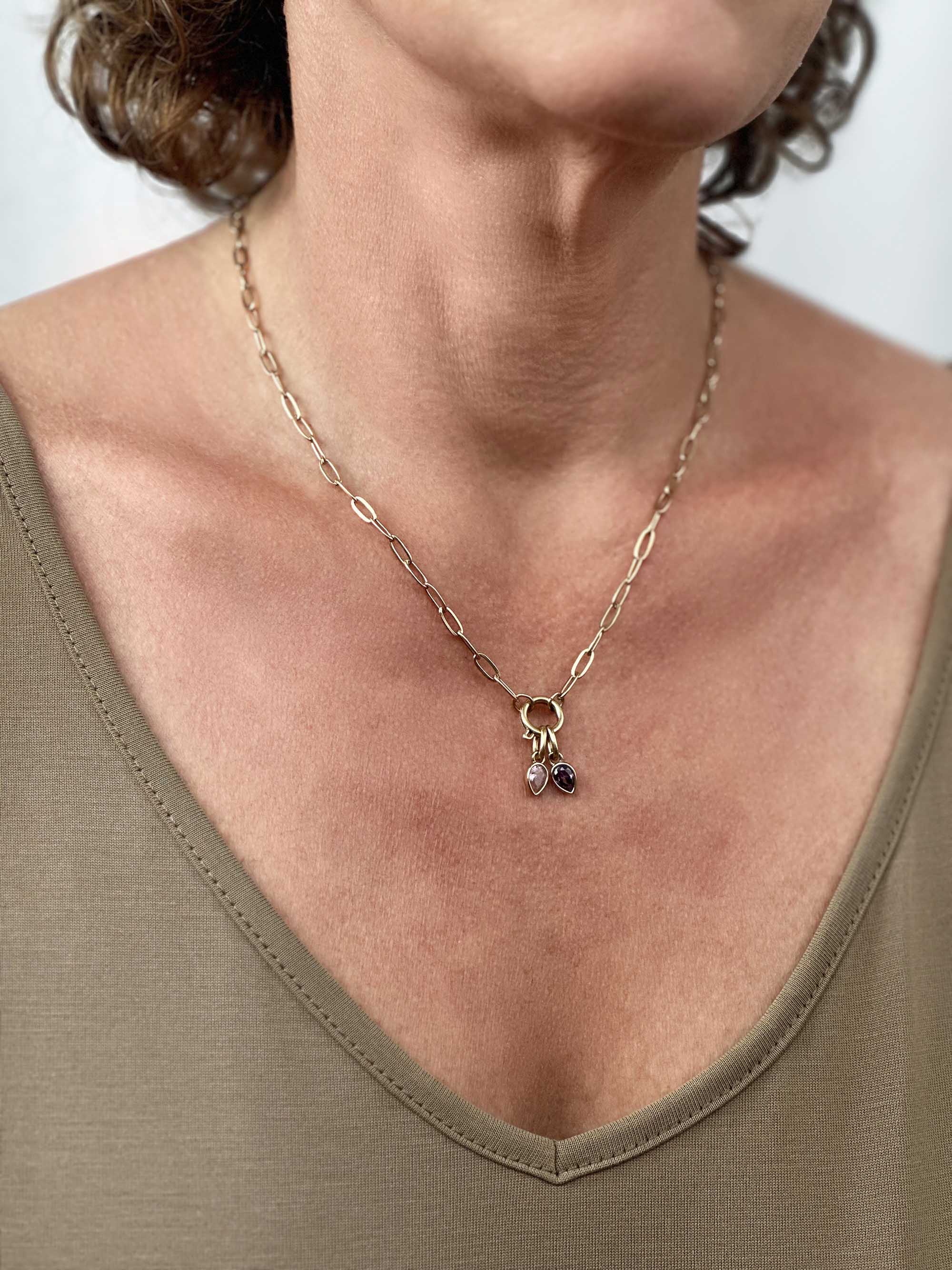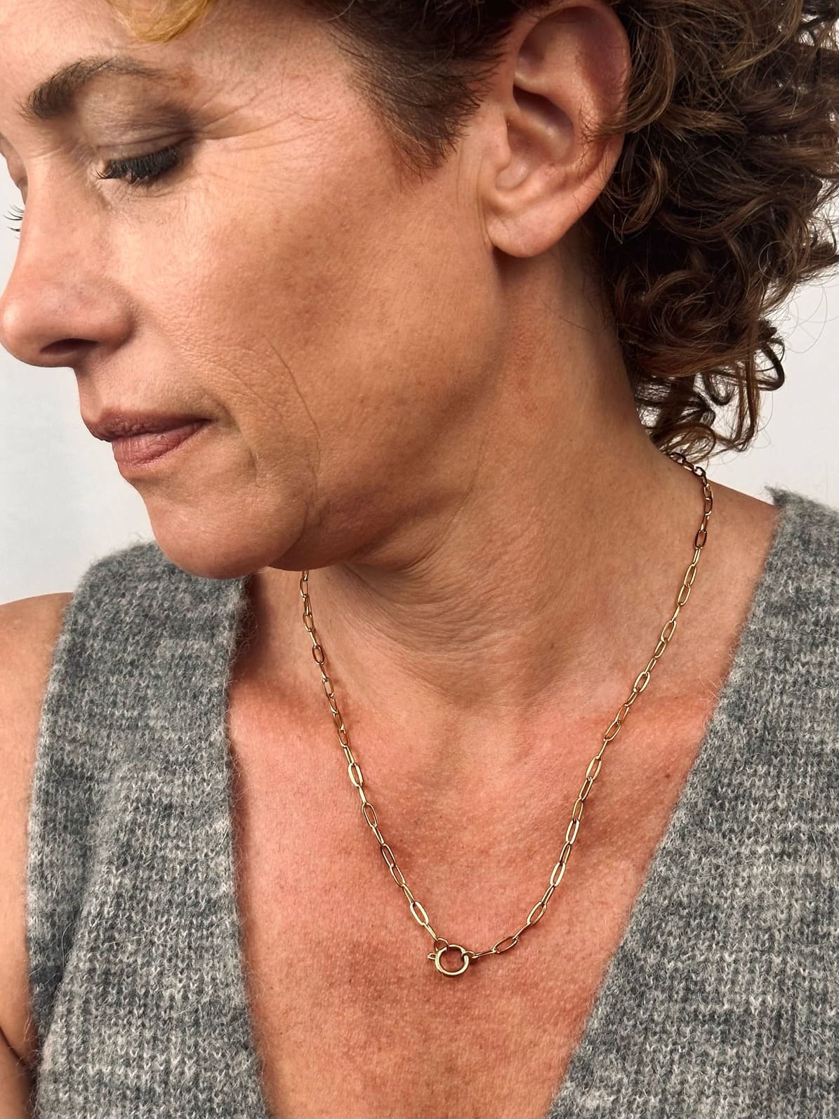 Minimal with a modern edge, the Paperclip O Necklace features elongated chain links and a bold circular clasp detail at the front. Wear it as-is for sleek styling, or clip on a birthstone charm or two to make it your own. Effortless, elegant, and made for layering.