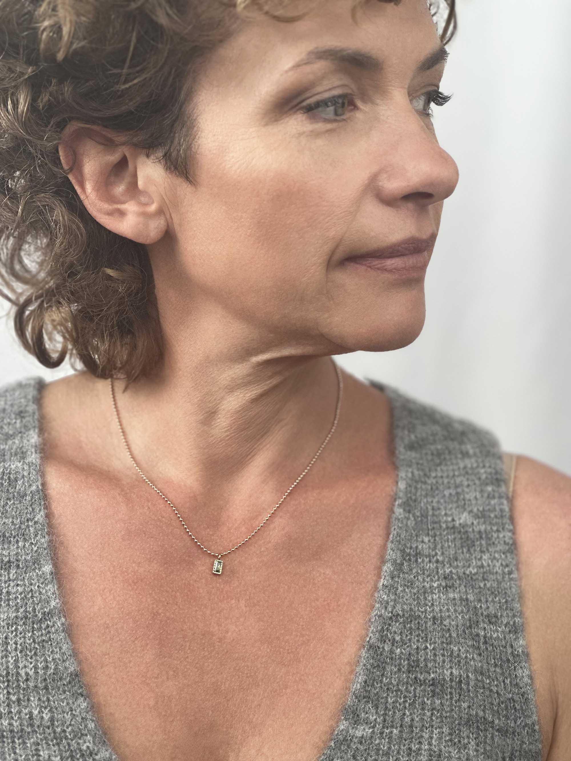 Delicate and elegant, the Lilac Gem Necklace features a soft purple stone in a rectangular cut, suspended from a fine gold chain. It’s the perfect hint of colour—subtle, feminine, and easy to wear every day. A gentle pop that brings a little glow to your neckline.
