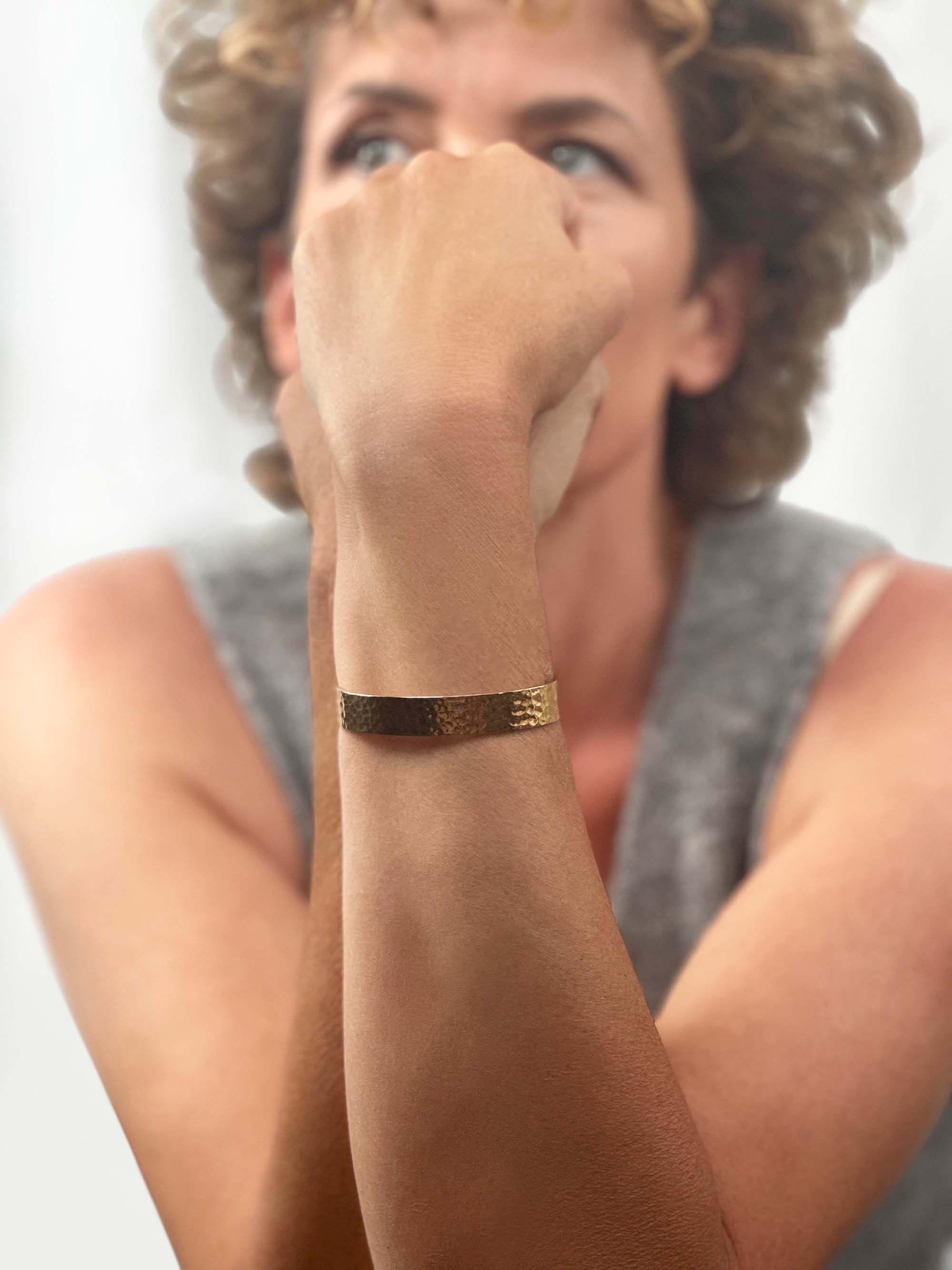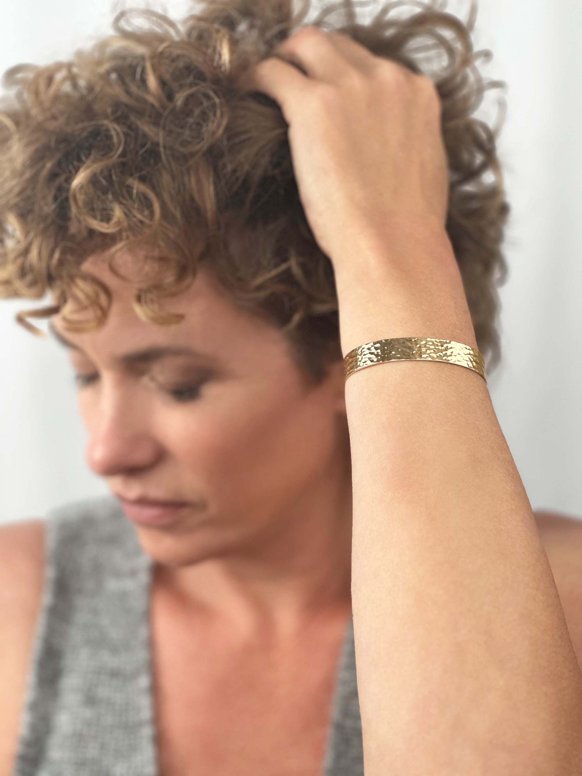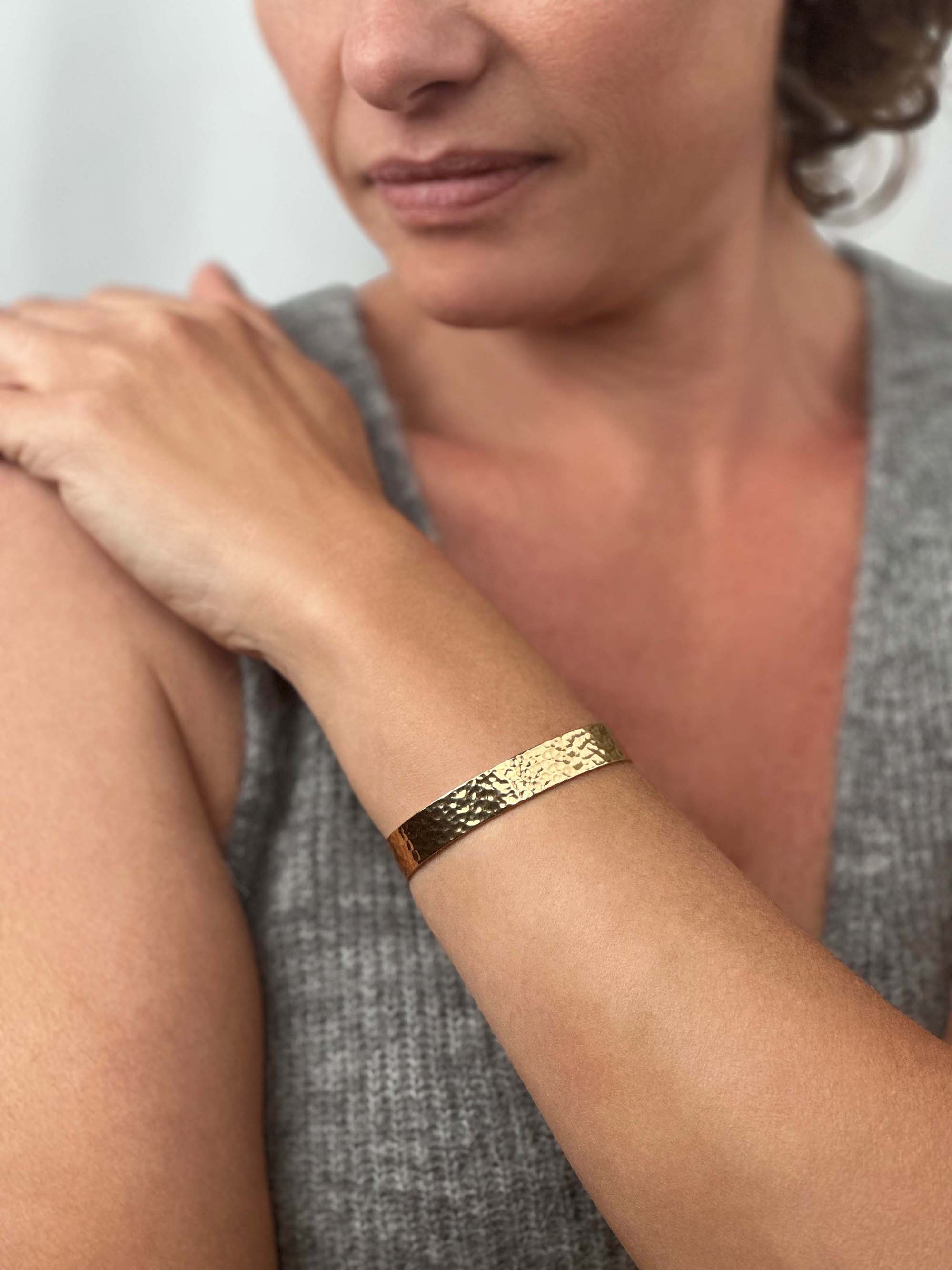 Textured and timeless, the Softly Hammered Cuff features a gently hammered surface that catches the light with every move. Its open design makes it easy to slip on, while the golden finish adds warmth and style. A beautifully tactile piece with a handcrafted feel.