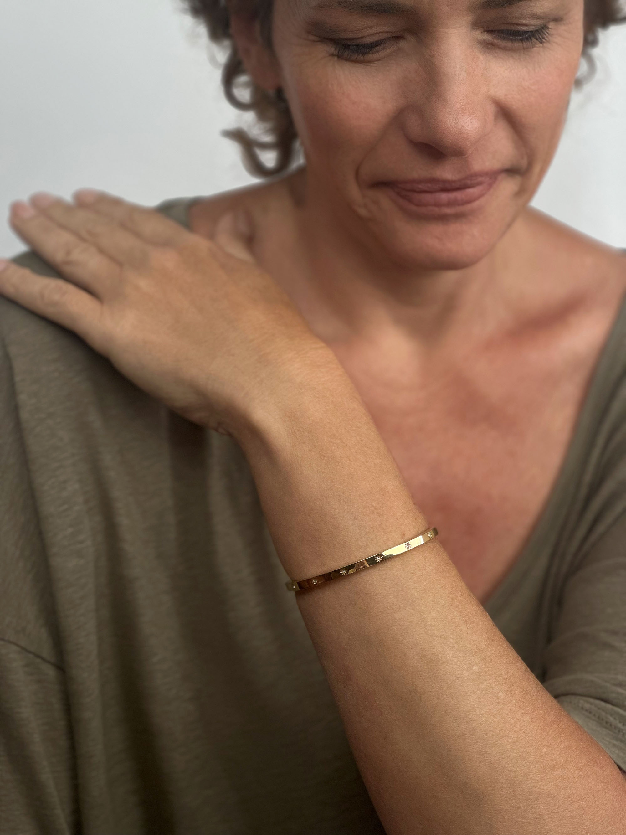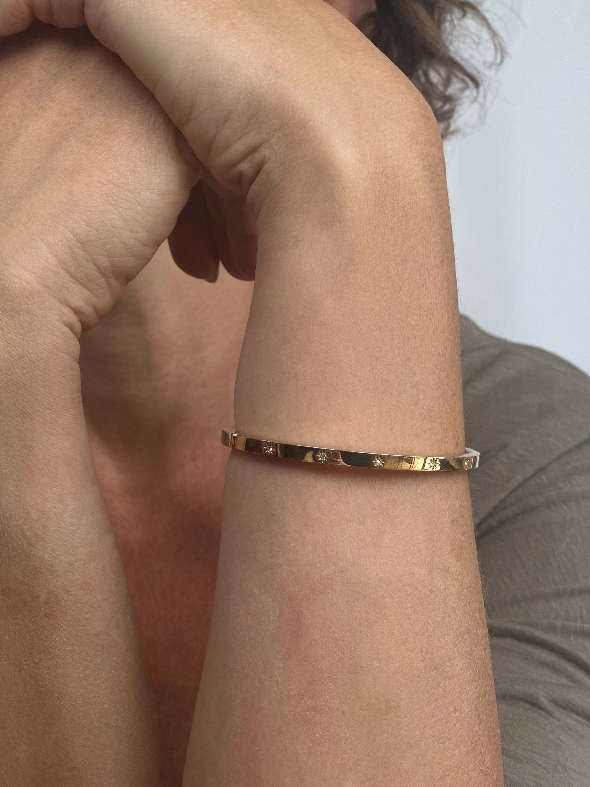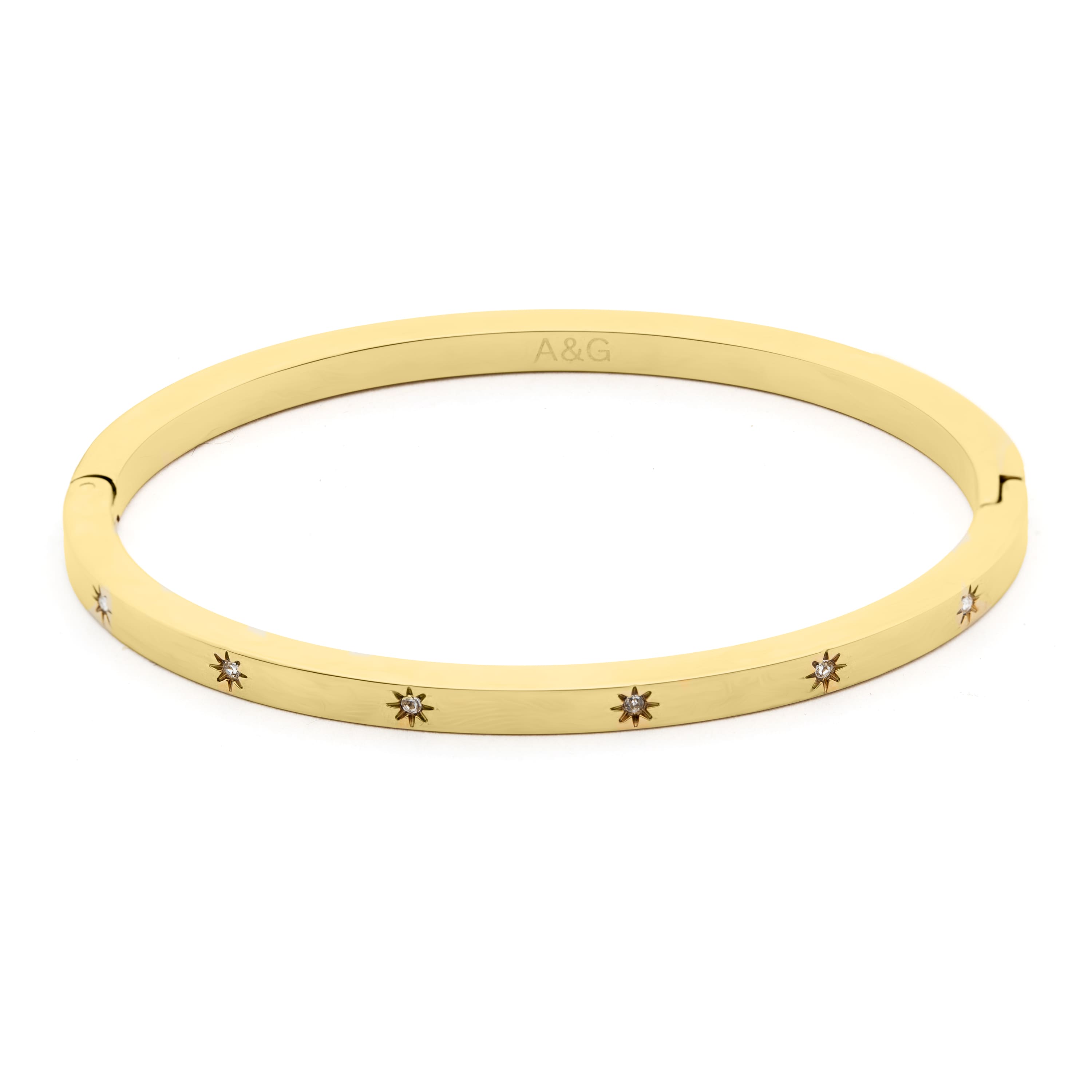 Refined and radiant, the Starlight Clasp Bangle features a slim gold band adorned with delicate star-set stones that shimmer as they catch the light. Designed with a hidden hinge and secure clasp, it’s easy to wear and effortlessly elegant. A subtle statement with a celestial touch.