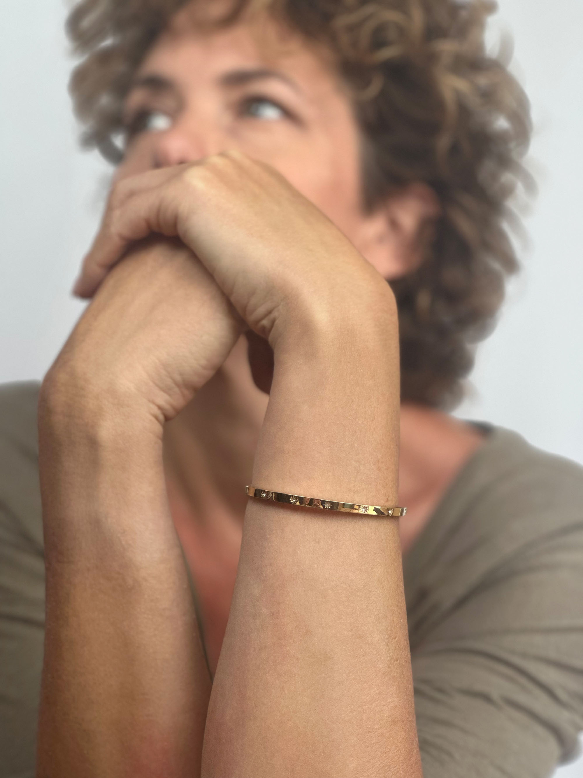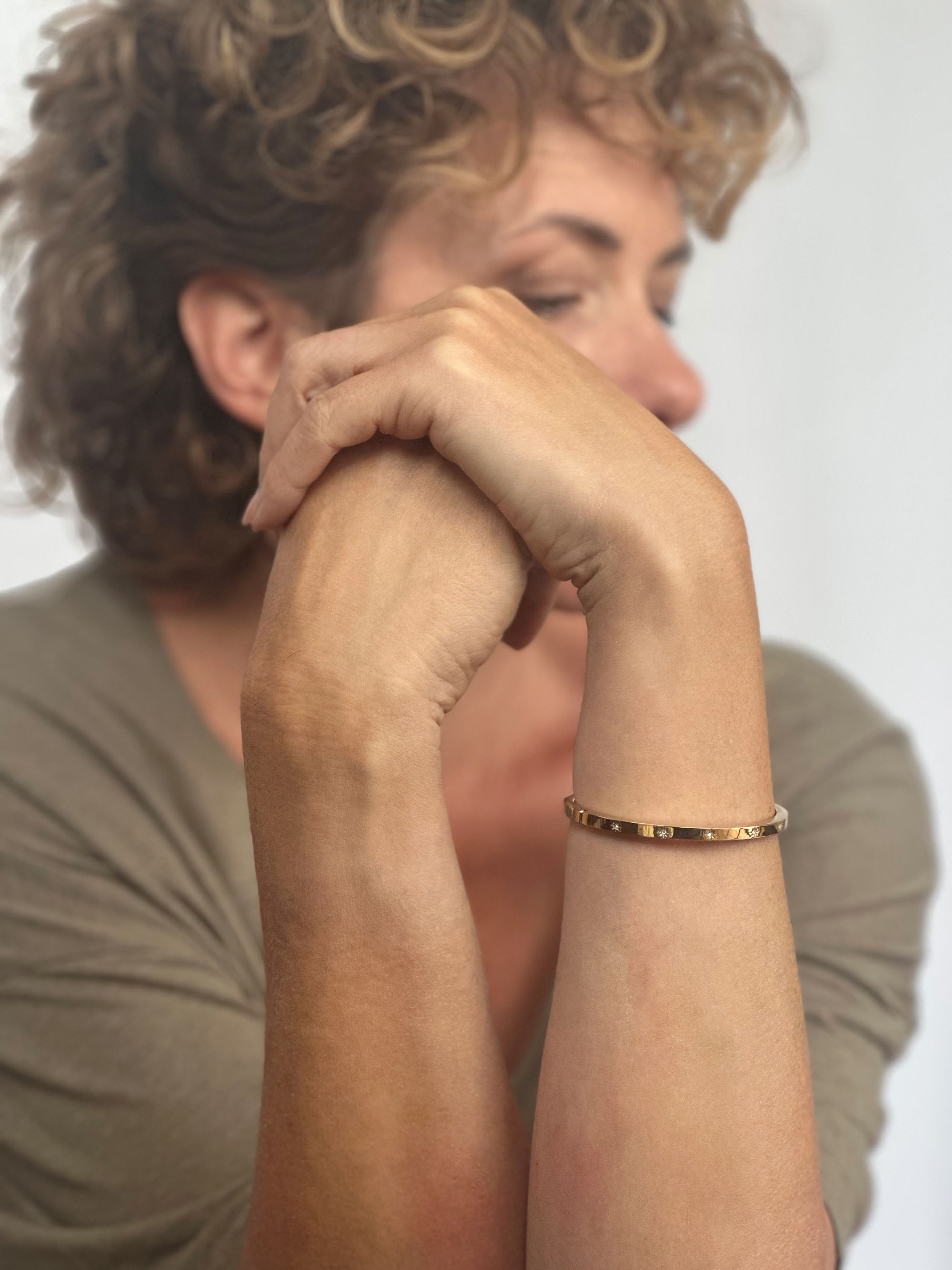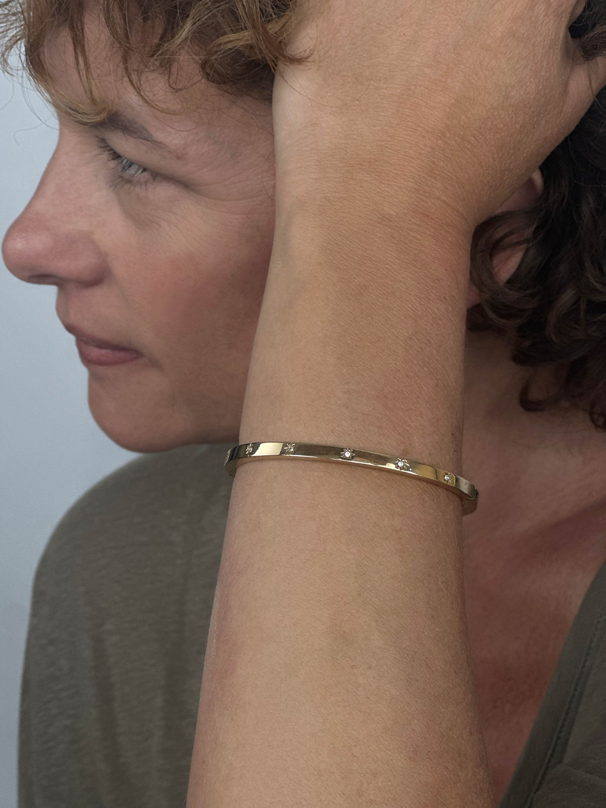 Refined and radiant, the Starlight Clasp Bangle features a slim gold band adorned with delicate star-set stones that shimmer as they catch the light. Designed with a hidden hinge and secure clasp, it’s easy to wear and effortlessly elegant. A subtle statement with a celestial touch.