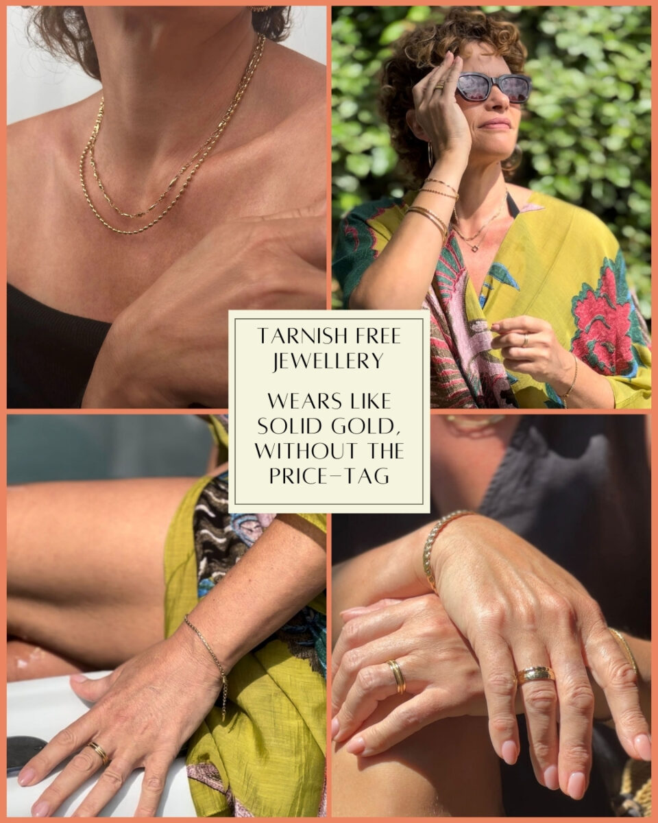 Our tarnish-free jewellery is made to look and feel just like solid gold. With its rich colour, comfortable weight, and everyday wearability, it’s hard to tell the difference—except on your bank statement!